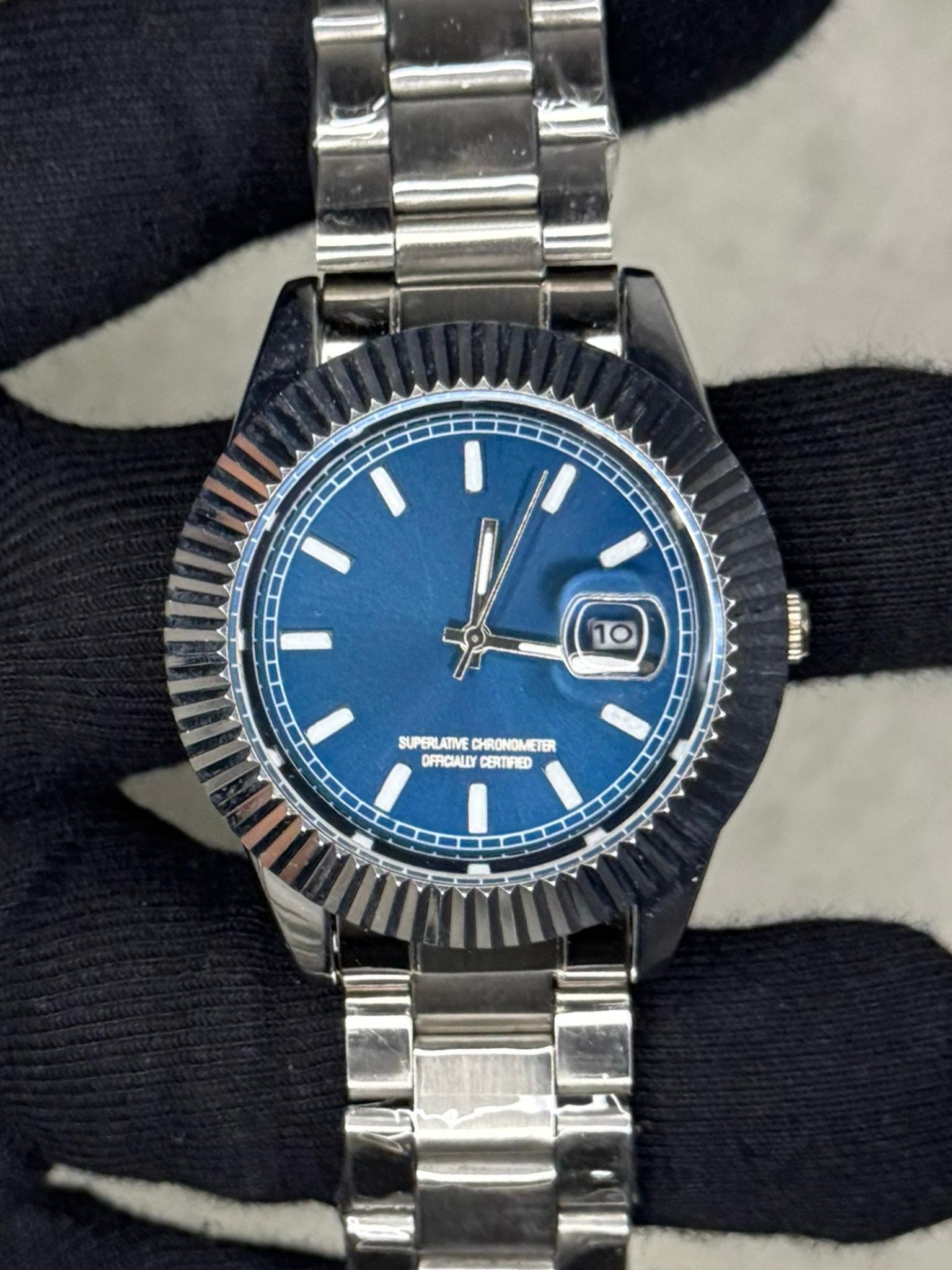 Tırtıklı çerçeve detayı ve derin mavi kadranı ile sofistike bir görünüm sunar.